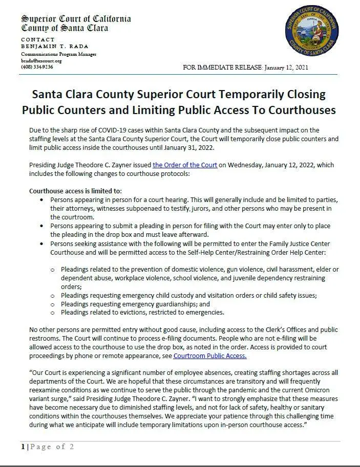 We received an update from the court temporarily closing public counters and limiting public access to courthouses. We included the two-page press release below.
